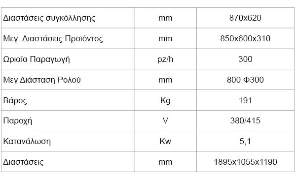 Διαστάσεις κόλλησης 870x620mm με μέγιστο ύψος προϊόντος 310mm. Mέγιστο πλάτος ρολού 800mm. Ταχύτητα παραγωγής μέχρι και 300 τεμάχια/ώρα.